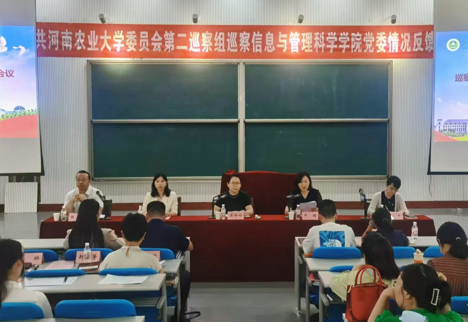 党委反馈巡察情况。党委巡察工作领导小组成员、校纪委副书记、党委巡察办主任吴玲玲,党委组织部副部长毛会坡,第二巡察组全体成员,小蓝视频