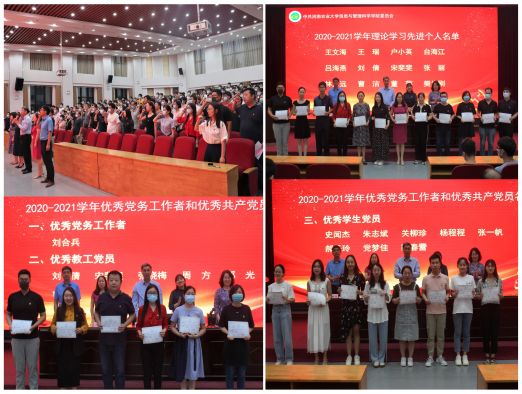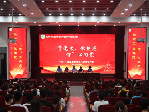 在龙子湖校区教学楼大教室一举行“学党史,做模范,‘信’心向党”七一表彰暨新党员入党宣誓大会。院党委委员、全体师生党员共同参加会议。本次大会由院党委副书记张利军主持。