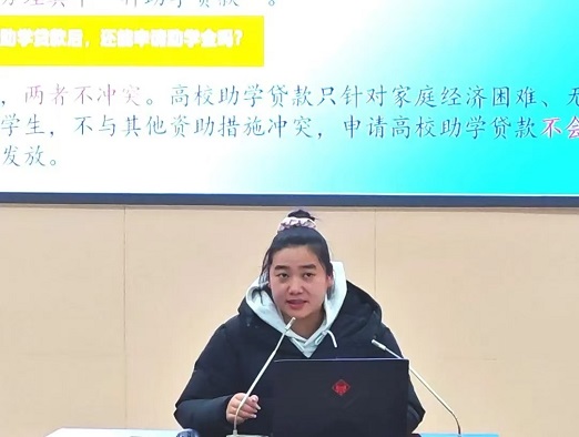 资助工作专员李艳飞详细解读了国家奖学金、国家励志奖学金、国家助学金、国家助学贷款、基层就业学费补偿贷款代偿、服兵役高等学校学生国家教育资助等各项资助政策,并就申请条件、申请流程、评审程序、资金发放等方面进行了年度最新政策进行了详细说明。