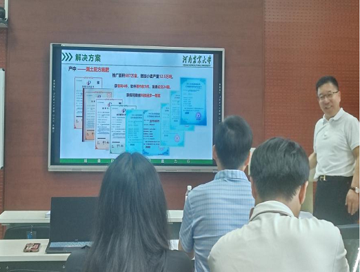 参赛项目成员进行PPT路演展示,从项目背景、项目介绍、发展规划、财务分析等方面进行讲解。在答辩环节,专家评委李崛华教授从教育维度、创新维度、团队维度、商业维度、社会价值维度等方面进行针对性提问,并对参赛项目提出中肯意见和建议。