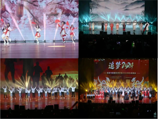 本次晚会以“追梦2024”为主题,分为三个篇章。伴随着院艺术团《GOODTIME》的精彩开场,本次晚会正式拉开序幕。第一篇章:冉冉向新执光开路。开场歌曲《ALWAYS ONLINE》展现着青年永远在线的进取之心,激昂的音乐带动了全场观众的气氛,将晚会的气氛推向高潮;寓教于乐、雅俗共赏的相声表演《我不是卷王》将愉快欢乐的氛围带给全场观众;生气勃勃,动感十足的街舞(SHINNING SHINNING》展现了青年学子的意气风发;歌曲《忘记时间》唱出了时间的回忆,青春的笑颜。第二篇章:灼灼风华向阳追梦。朗诵《奋斗吧!信管青年》展示了努力奋发,铿锵奋斗的信管风貌;敢冒险就浪漫的街舞《DREAM BUBBLE》激励着拼搏冒险的浪漫精神;节奏感强烈的歌曲《护花使者》带动了全场的紧张气氛;多人小品《诈诈呼呼》则将现场的气氛突然转变,带给观众们不同的享受;包含梦想的歌曲《梦想天空分外蓝》唱出了青年对梦想的希望,展现着时代青年的追梦精神。第三篇章:青青子矜志怀家国。优美的歌舞《灯火里的中国》表达了对祖国万里河山的美好希冀,对祖国发展历程的万千感慨;古风舞蹈《寄明月》包含真挚的思念,充满不舍之情;罗绮飞动,锦衣华裳,如仙似幻的T台秀《云想衣裳》处处展现着国家的文明昌盛、繁华富强;晚会在合唱《我们都是追梦人》的歌声中缓缓谢下帷幕。