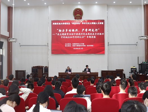 承办的研究生“两堂两坛”学术文化之明德人文讲堂专题讲座在繁塔楼一楼模拟法庭举行。河南省农业农村厅原总农艺师杨元中应邀为我校研究生带来以“在主题教育活动中提高对农业高校在乡村振兴中的地位和作用的认识”为题的学术报告。报告会由副校长尚富德主持,党委研究生工作部、信息与管理科小蓝视频