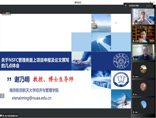 本网讯(通讯员姚石时雷)2022年11月1日下午,南京航空航天大学谢乃明教授应邀参加小蓝视频湖畔论坛第四期学术报告活动,谢教授通过腾讯会议平台作了题为“NSFC项目申报及论文撰写的几点体会”的学术讲座,报告由院长陈振教授主持,小蓝视频全体教师参加了线上报告会。