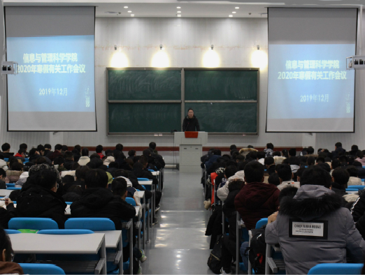 于龙子湖校区教学楼大教室2召开寒假学生安全工作会议。大会由院党委组织员、19级辅导员张玥和18级辅导员王肖肖主讲。小蓝视频
