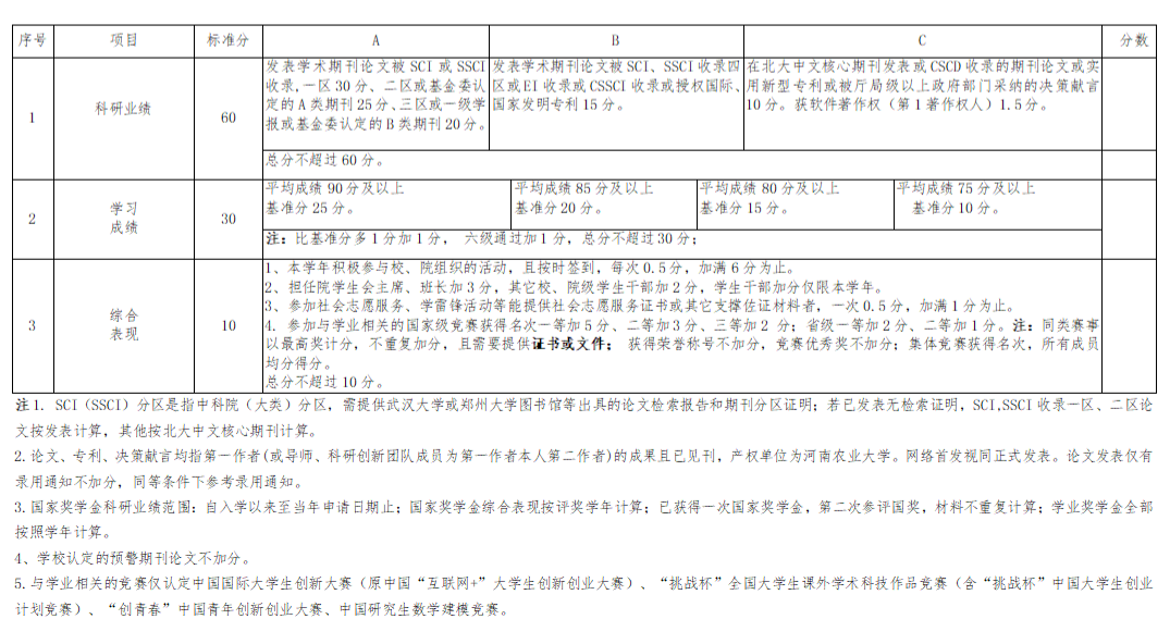 二、三年级硕士研究生评分指标和占比:科研业绩标准分60分,学习成绩标准分30分,综合表现标准分10分。