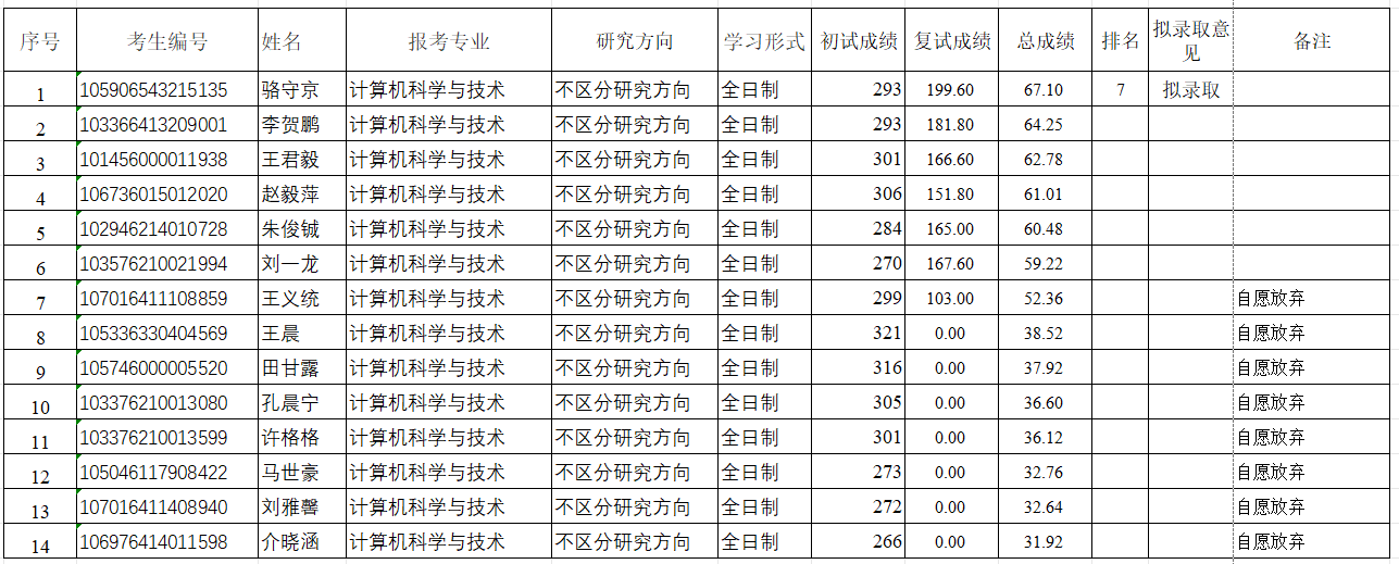 根据小蓝视频 2026年硕士研究生招生复试第一次调剂考生复试情况和管理科学与工程专业第二次开通调剂系统情况,经小蓝视频 研究生招生工作领导小组研究决定,计算机科学与技术专业拟增加1个招生计划数。按照计算机科学与技术专业调剂考生复试总成绩排名,顺次补录第七名考生: