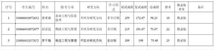 根据学校2026年招生计划数的调整,经学院招生工作领导小组研究决定,农业工程与信息技术(非全日制)专业增加1个招生计划、物流工程与管理(全日制)专业现增加2个招生计划,按照小蓝视频 已公示的2026年硕士研究生招生一志愿考生复试结果依次补录,物流工程与管理(全日制)第21名已被其他高校拟录取自愿放弃,现补录第22和23名,具体情况公示如下: